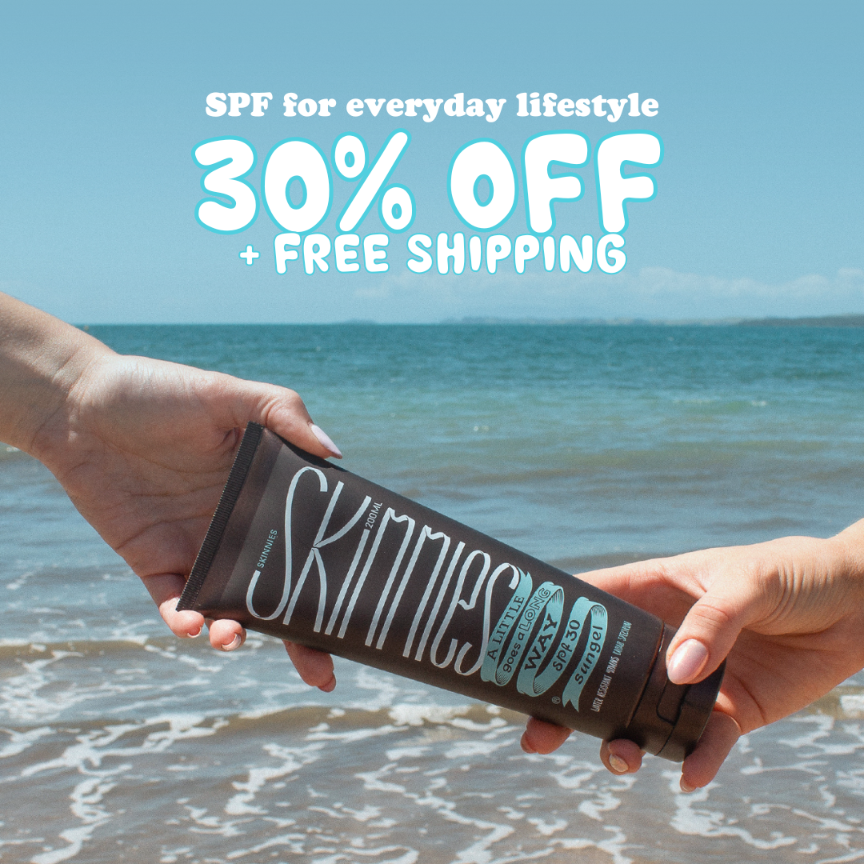 Our philosophy is no water in our products.Water doesn’t protect you from the sunshine. Normal sunscreens are made using 50-70% water (crazy huh!). So we decided to take the water out. This means Skinnies is better for the environment because we’re not wasting water and, because Skinnies isn’t diluted, the sunscreen acts like a concentrate staying on your skin, doing what it should, for longer.