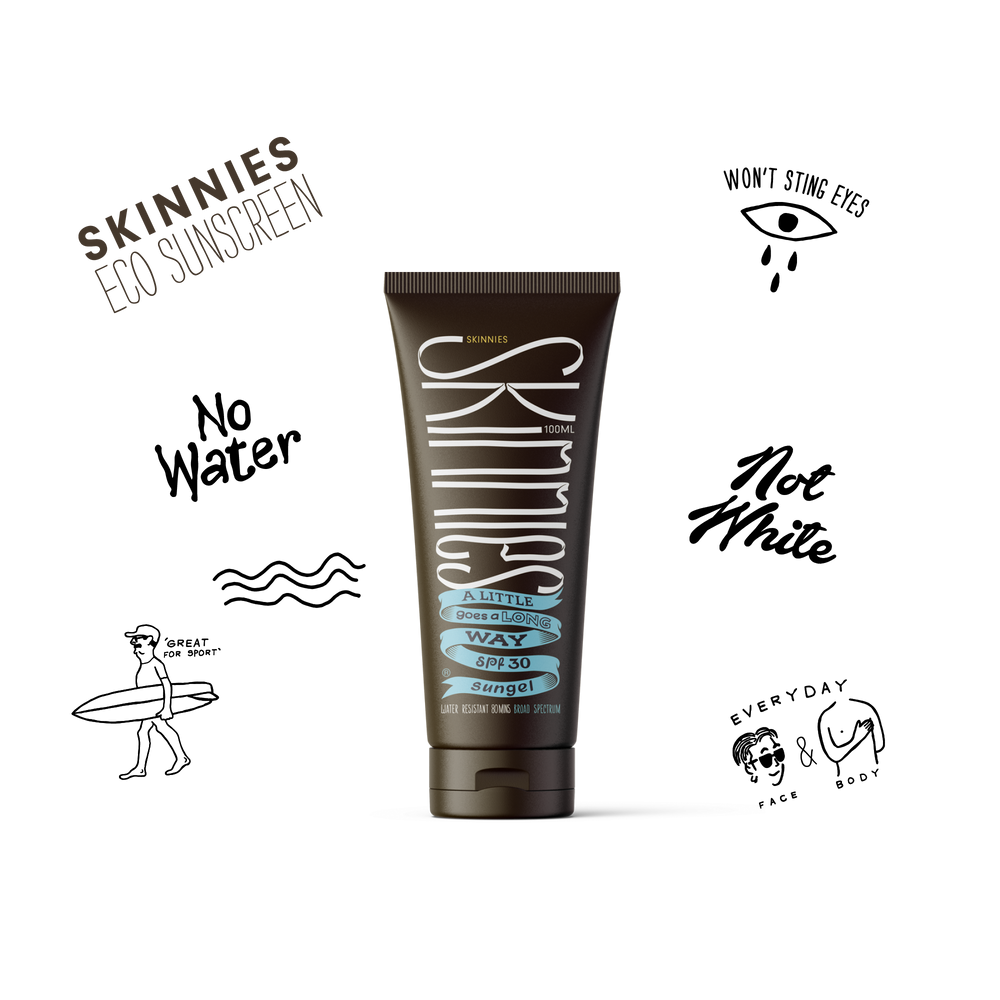 Our philosophy is no water in our products.Water doesn’t protect you from the sunshine. Normal sunscreens are made using 50-70% water (crazy huh!). So we decided to take the water out. This means Skinnies is better for the environment because we’re not wasting water and, because Skinnies isn’t diluted, the sunscreen acts like a concentrate staying on your skin, doing what it should, for longer.